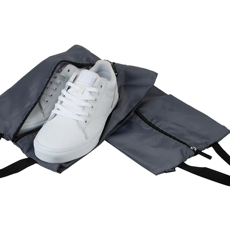Stay organized when you travel with the G Force traveling shoe bags. This set of two bags can easily fit one pair of dress shoes, sneakers, heels, or flats in each bag. Durable and lightweight, these shoe bags fit in almost every type of luggage. Protecting your shoes from dirt, scuffs, and scratches while protecting your other items within the luggage from the shoes. Made of ripstop nylon, these bags are sure to last many of your trips. Make your life and trip easier with this set of shoe bags.