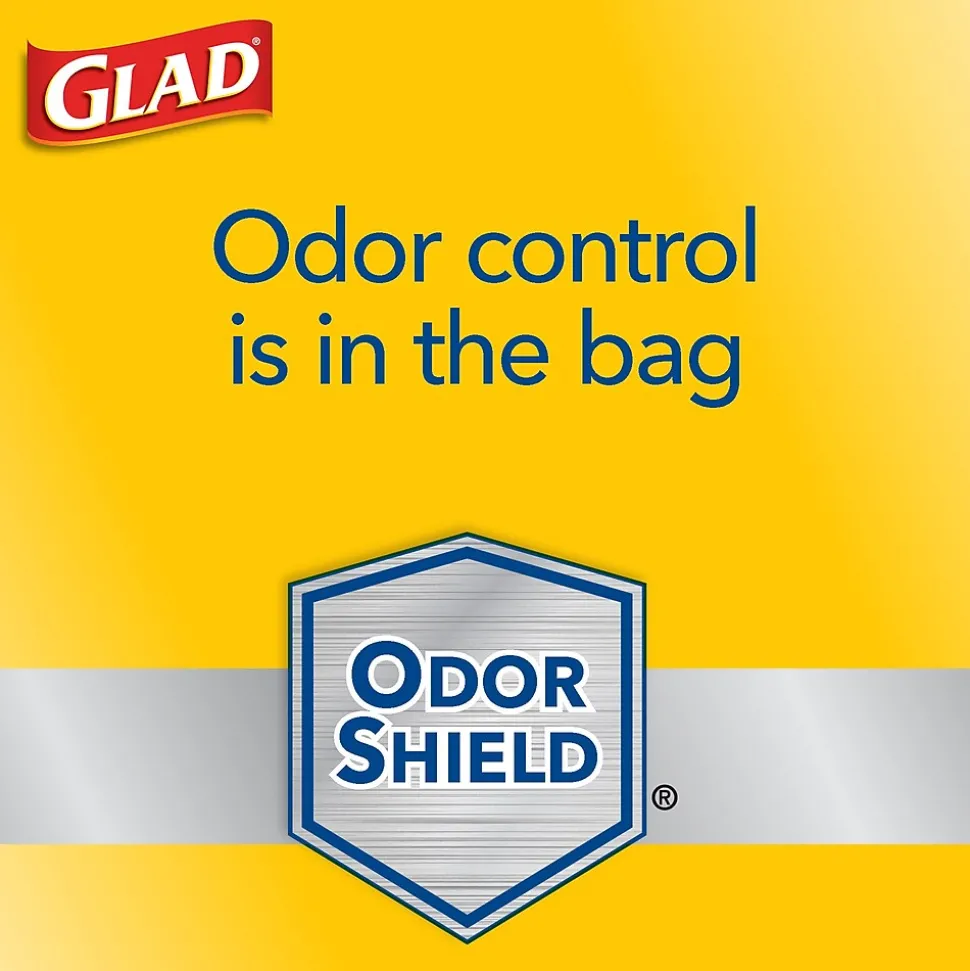 Neutralize nasty kitchen odors with Glad. These OdorShield bags provide lasting freshness as it continuously neutralizes nasty kitchen odors. The ForceFlex technology delivers extra toughness as it flexes and expands around sharp edges and heavy loads without ripping. Featuring RipGuard and LeakGuard technology, these trash bags guard against punctures and tears, and traps liquids in the bag so you can put your most demanding trash up for the challenge. Let the stretchable strength of Glad handle all the messes our busy daily life can throw at it and then some. The Grips-The-Can Drawstring ensures that the bag stays in place, until you are ready to take it out.