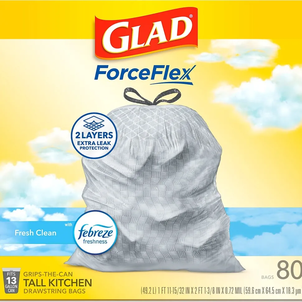 Let the stretchable strength of GladĀ® ForceFlex handle all the messes our busy daily life can throw at it and then some. GladĀ® Tall Kitchen Drawstring Trash Bags are designed with ForceFlex technology to give extra flex as it expands around sharp edges and heavy loads, so you can pack it in while resisting tears, rips and punctures. These trash bags are designed with two layers for extra leak protection. RipGuardĀ® and LeakGuardĀ® technology prevent seepage of liquids and keep trash contained. Fight nasty kitchen odors with the exclusive GladĀ® trash bag combination of steady release of Febreze freshness and irresistible Gain Fresh Clean scent that traps, locks and neutralizes odors. The durable Grips The Can Drawstring ensures a tight grip on the trash can to keep it in place. Take the trash to the curb with no fear of leaks and tears, and no frustration. FEBREZE and GAIN are used under license from The Procter and Gamble Company or its affiliates.