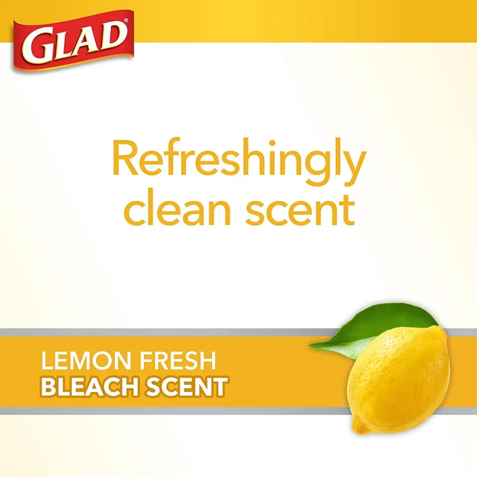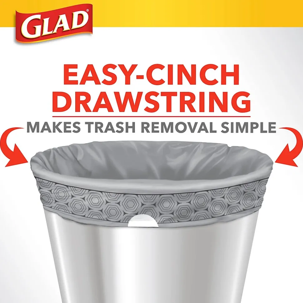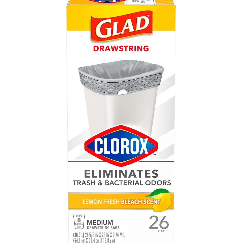 Glad and Clorox have joined forces to create a trash bag with the strength of Glad and the odor-fighting power of Clorox. Glad with Clorox Medium Drawstring Trash Bags eliminate trash and bacterial odors on the bag to help keep your home feeling fresh and healthy. These 8 gallon garbage bags fit medium size trash cans and are ideal for bathrooms, bedrooms, offices, nurseries and laundry rooms. Featuring a grey bag and printed hexagon design around the hem of the bag, these trash bags add a design detail to any room when they are folded around the edge of the can. Just a quick cinch of the durable drawstring makes trash removal simple. These versatile trash bags feature the clean smell of Lemon Fresh Bleach Scent. Glad with Clorox garbage bags work as hard as you do to help maintain a fresh and healthy feeling home with a versatile design for bins around the home.