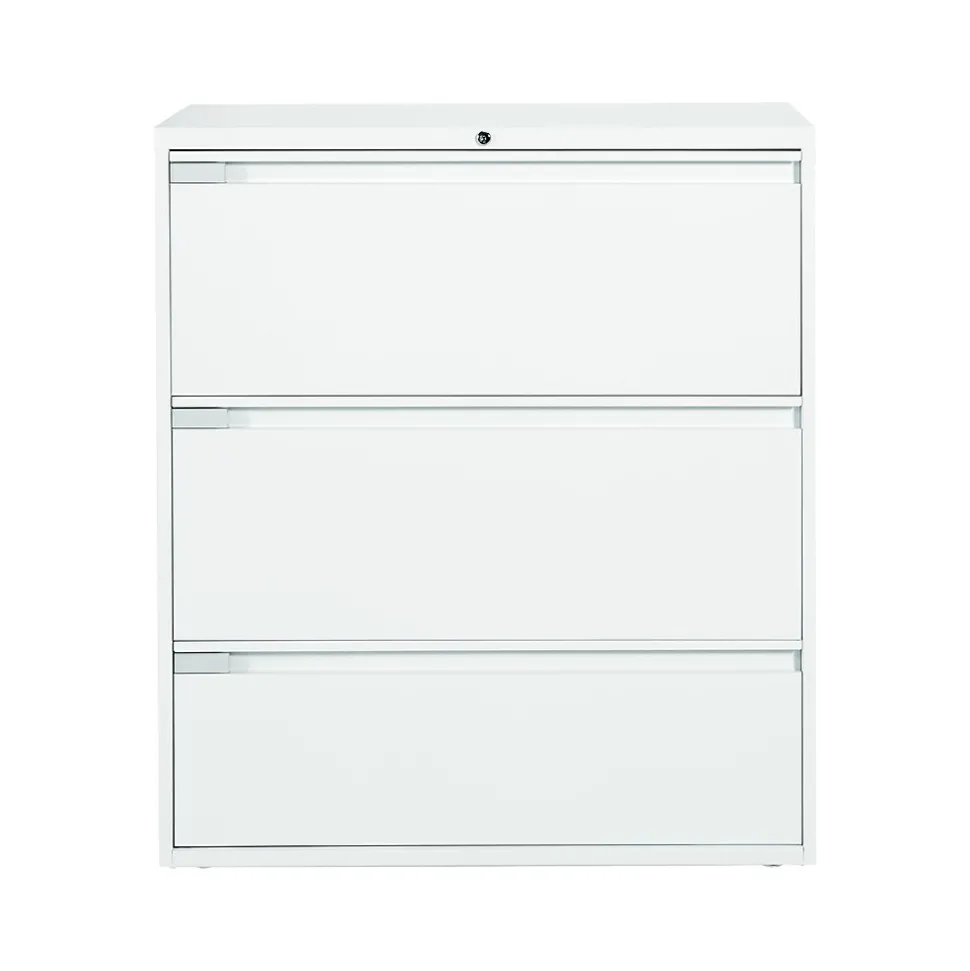 - Three-drawer lateral filing cabinet holds letter or legal-size documents
