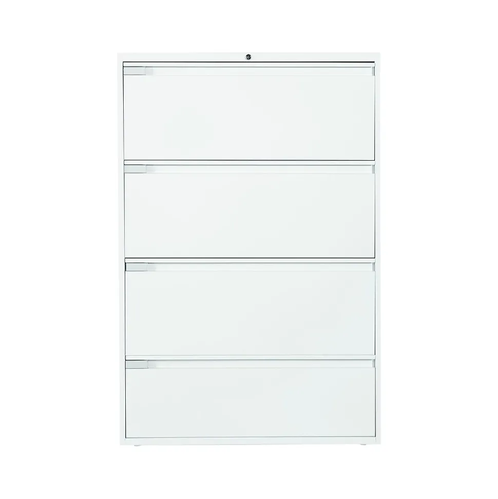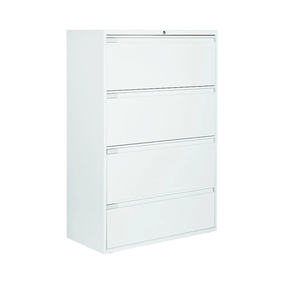 - Four-drawer lateral filing cabinet holds letter or legal-size documents