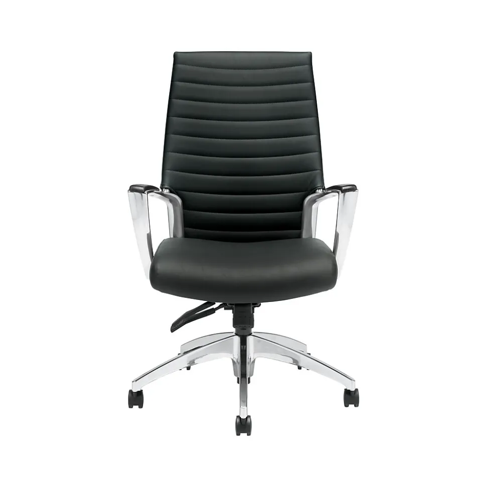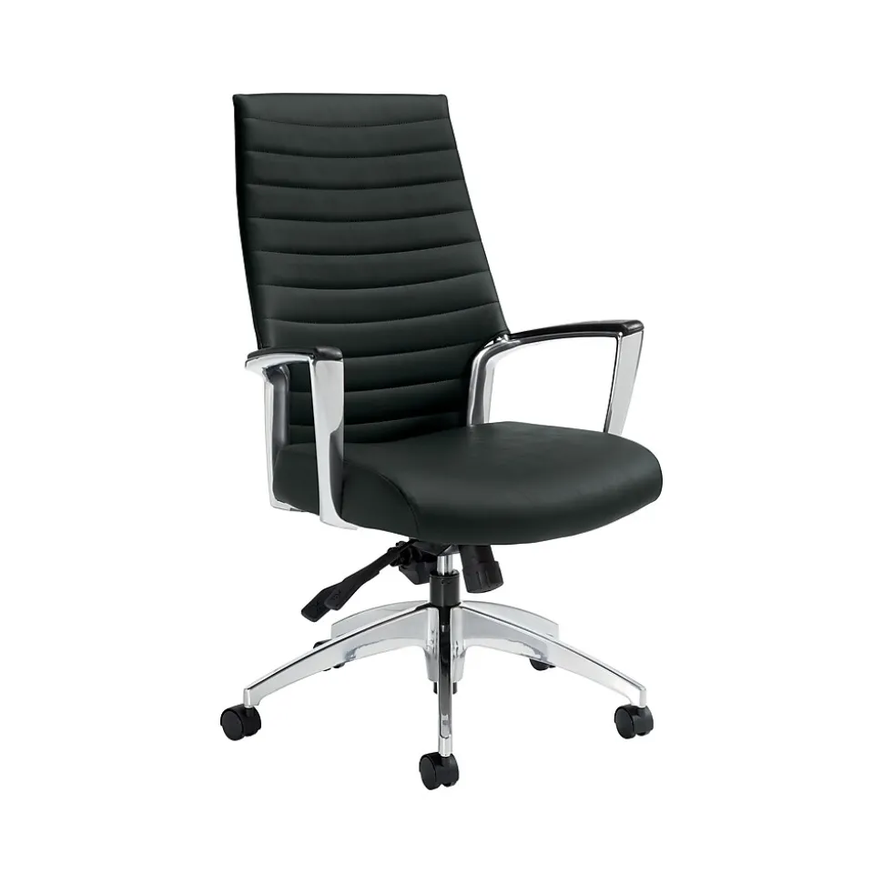 The Global Accord series features classic styling with finely detailed polished aluminum arms. The sling-style back is upholstered with rolled and pleated details, while the breathable mesh back promotes airflow and comfort while gently supporting the natural curve of the spine to reduce fatigue.