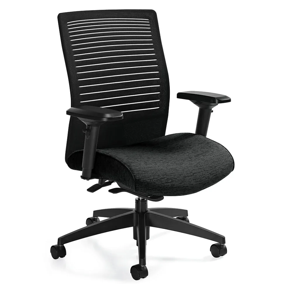 Global Loover Medium back fabric upholstered synchro-tilter in quilt black color has sliding seat depth control and G5 arm caps fulfill user priority. Aluminum finish enhances attractive look while nylon governor base gives stability.