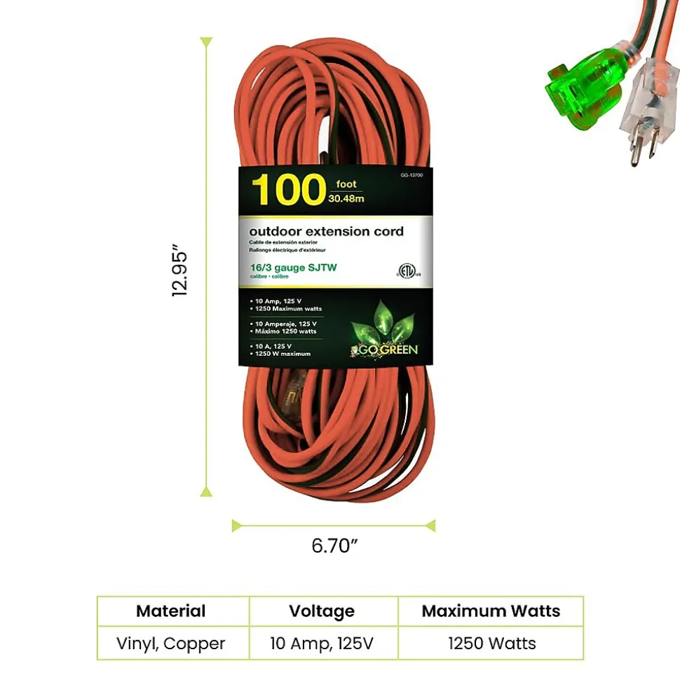 The GoGreen Power Heavy-Duty Extension Cord is ideal for multiple applications around your home’s exterior and garage. It resists moisture, abrasion and exposure to sunlight. The length of the outdoor extension cord allows you to cover a large area without the need for continuous stops to remove and replug. Use it to power your electric tools, lawn mower, to operate your generator and to provide lighting and music while entertaining. The cord is ETL listed and features a light on the end that shines when it’s in use.