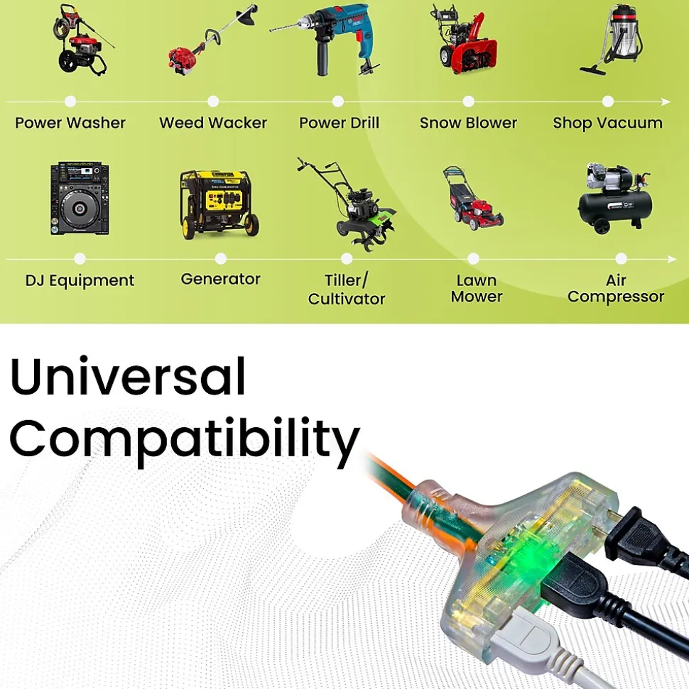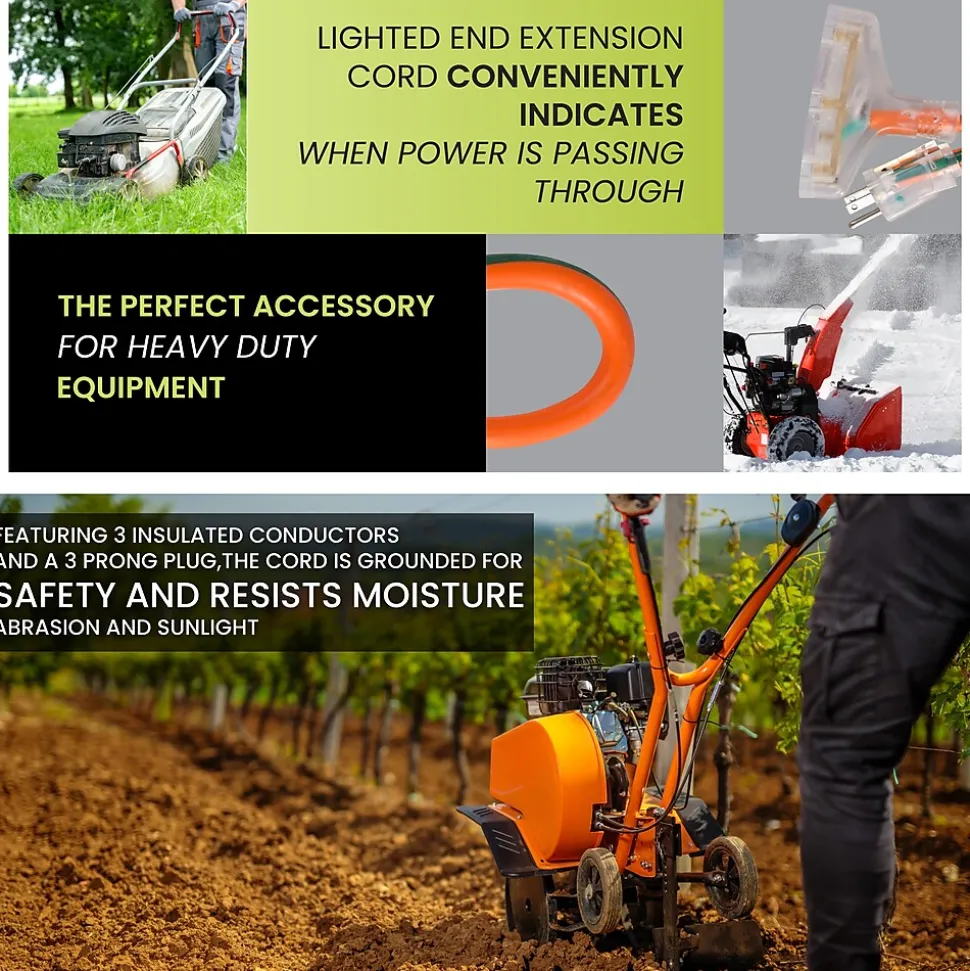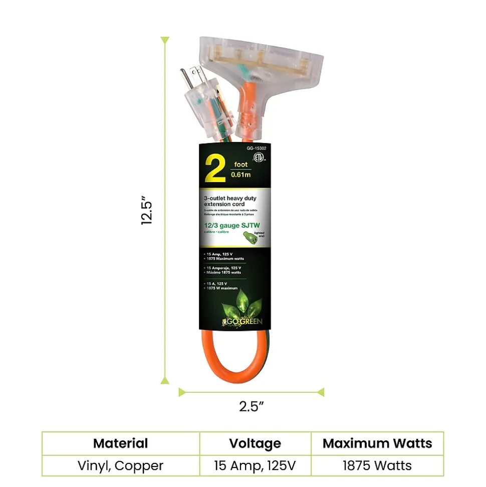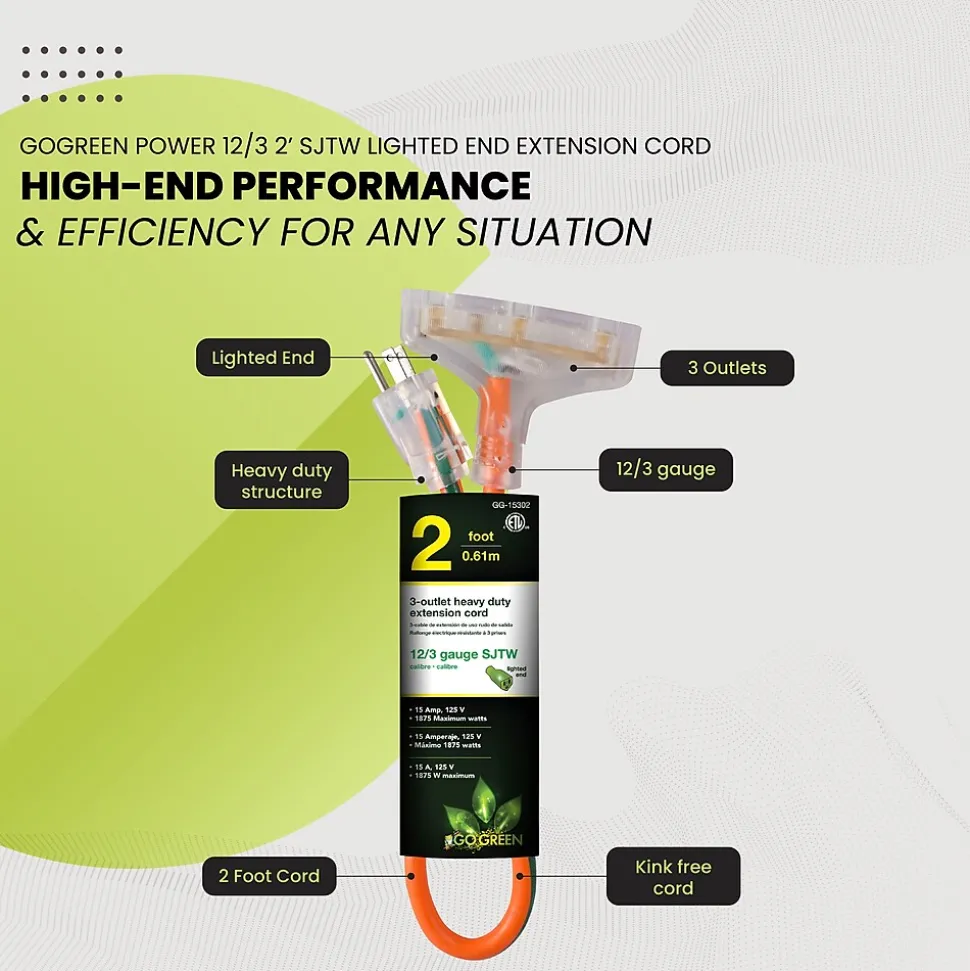 The GoGreen Power All-Weather Extension Cord is constructed of 100% TPE which guarantees maximum flexibility as well as abrasion and oil resistance in any type of weather. This cord is lightweight and tangle free and can sustain temperatures from 221 degrees F to -94 degrees F. Tested in some of the harshest weather conditions on the planet, the GoGreen Power all-weather cord is designed to last a lifetime! The heavy duty extension cord contains a lighted green end