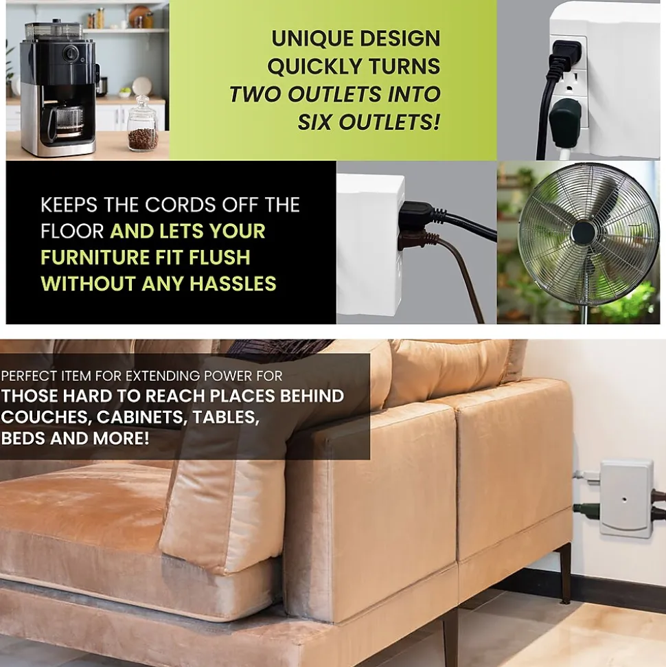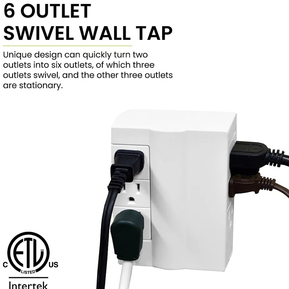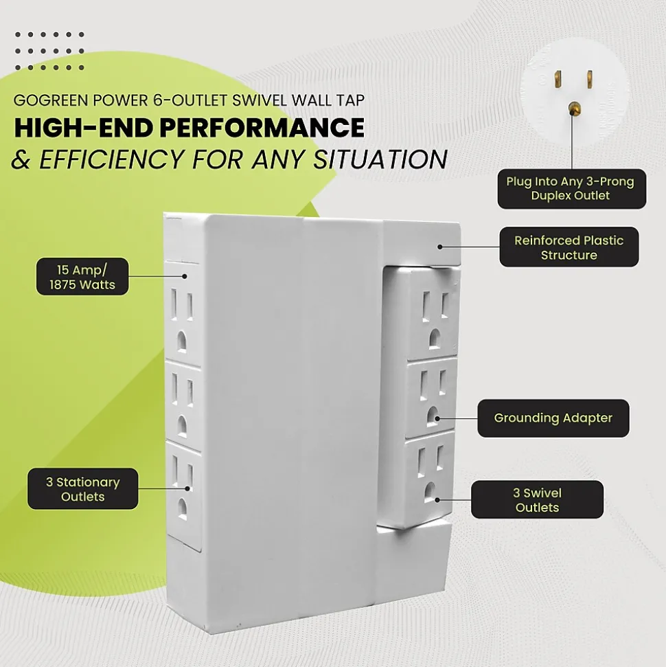 The GoGreen Power® Swivel Wall Tap features 6 outlets conveniently designed to fit behind furniture and appliances. The electrical tap is perfect for use with larger electronics such as computers, printers, smartphones, tablets and theater systems. The unit can be placed in any duplex outlet quickly converting two outlets into 6 outlets. The Swivel wall tap also comes with 1000 Joules of protection (please see model# GG-16310TSW).