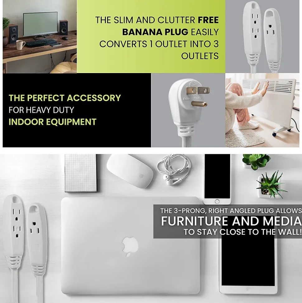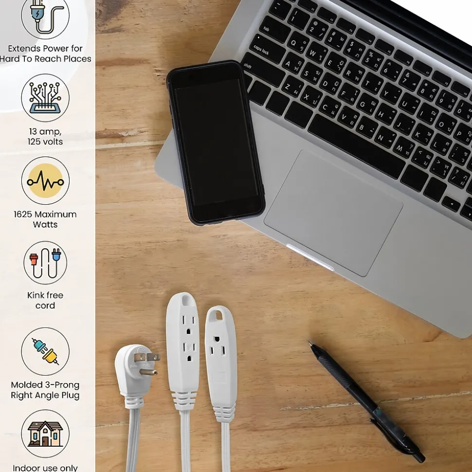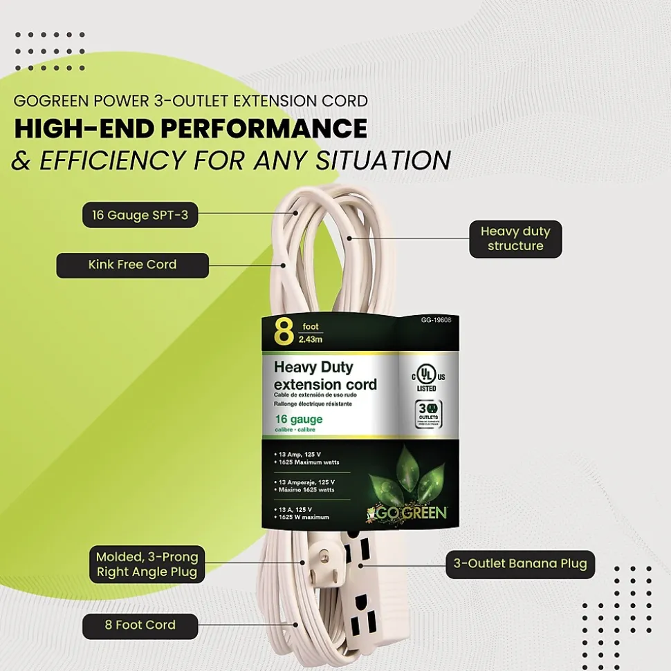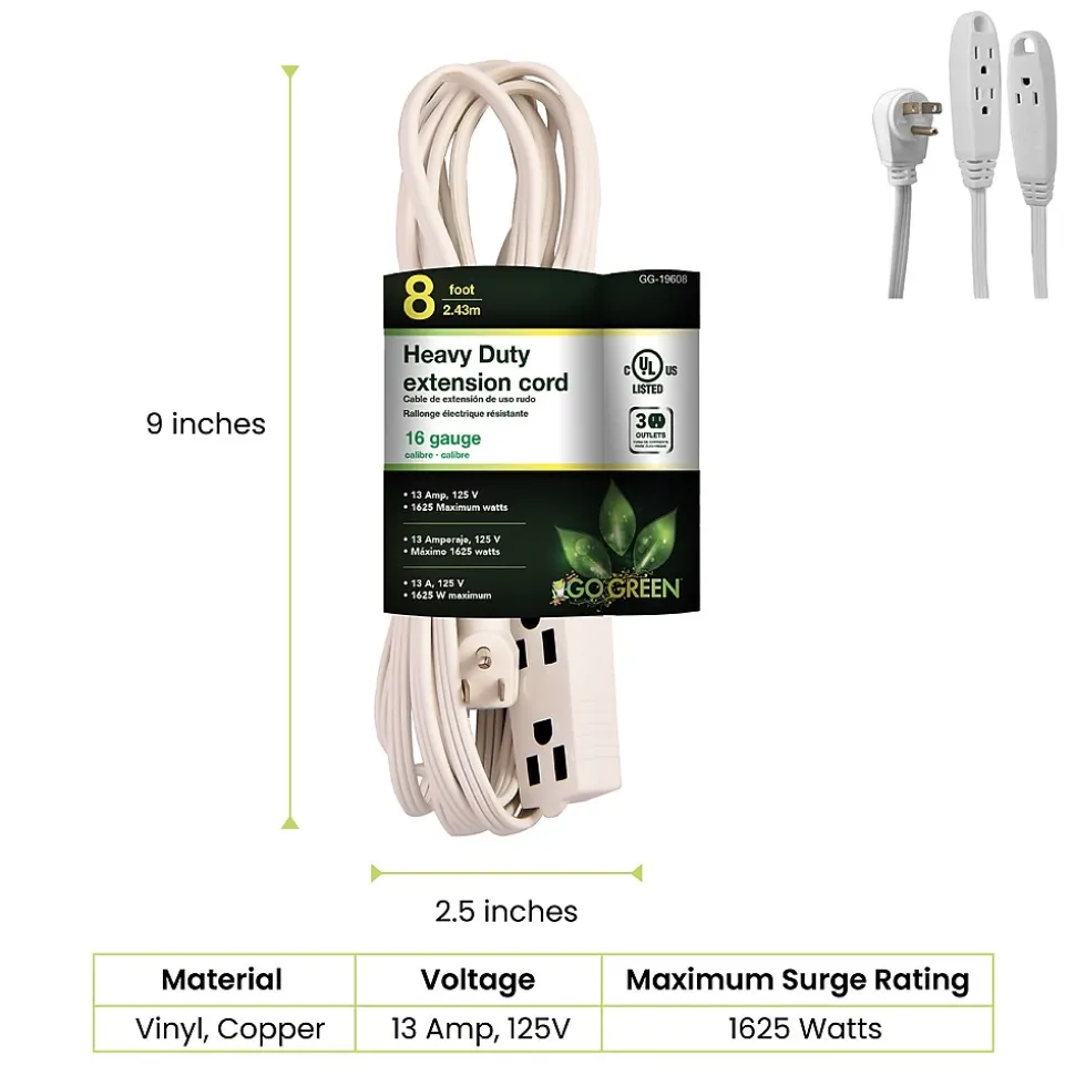 The GoGreen Power 8-foot 16/3 3-outlet extension cord is slim and reduces clutter. It quickly turns one outlet into three and is ideal for small home appliances and general household electronics.