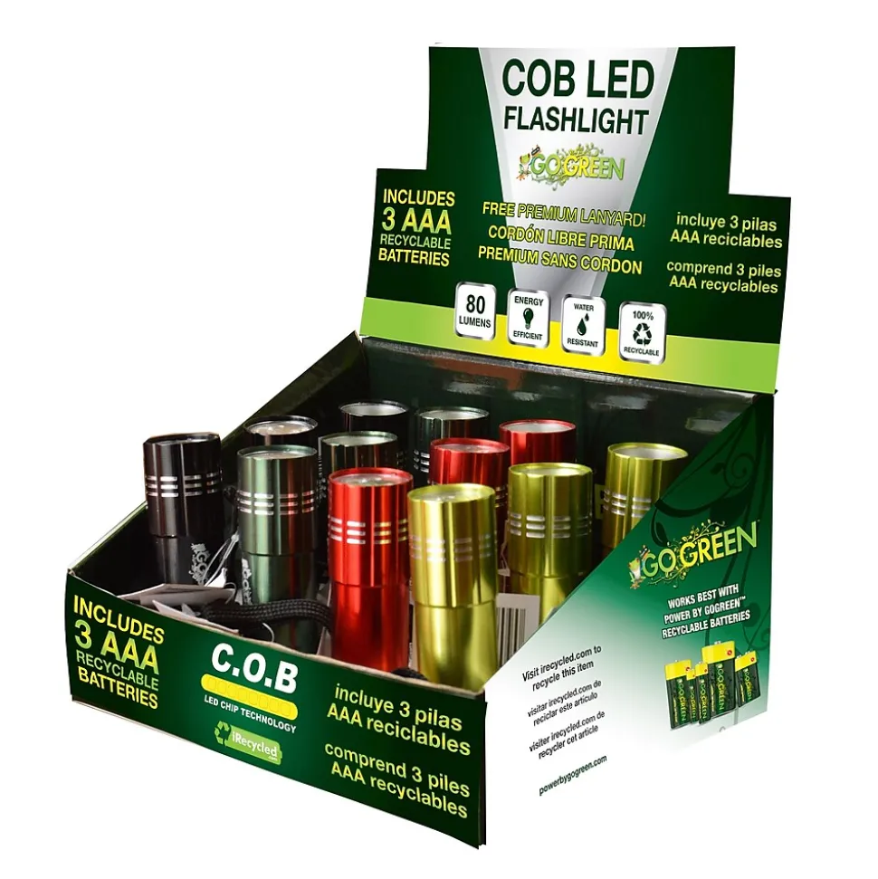 The COB LED Flashlight uses the latest and greatest COB LED technology. Flashlight is water resistant and contains a wrist strap. 3 AAA GoGreen batteries included.