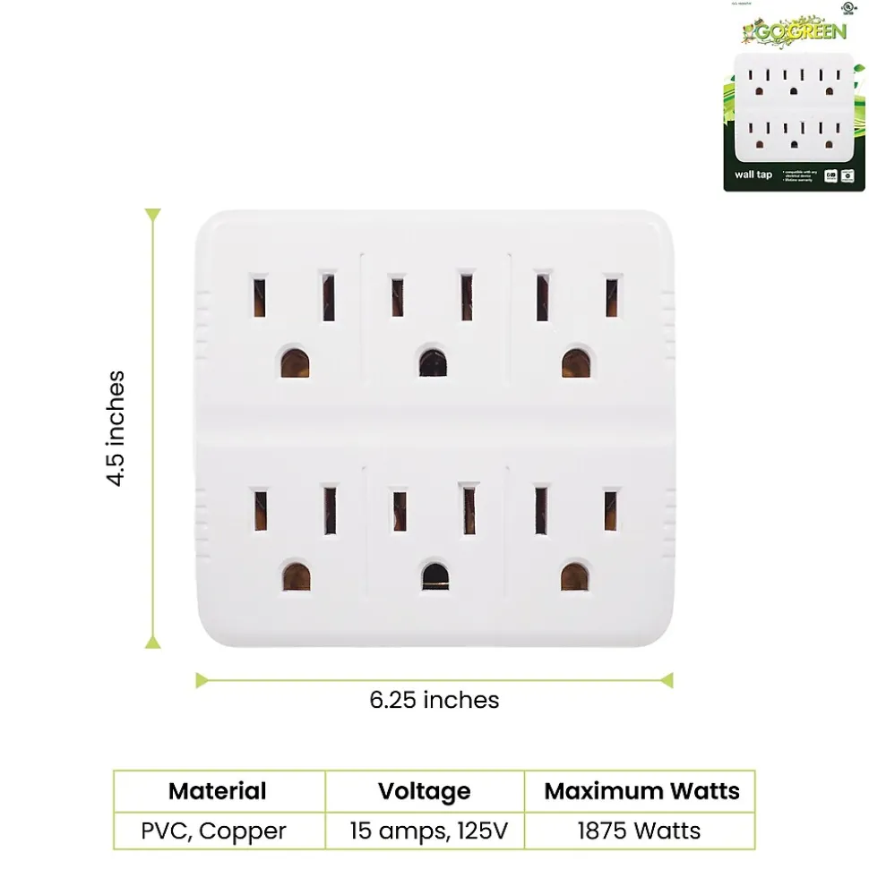 The GoGreen Power® 6 Outlet Wall Tap allows you to quickly turn two outlets into six outlets. The wall tap was designed using reinforced plastic for stability and to allow for bulky adapters to be used all at the same time. Each outlet is grounded and unit is UL certified to meet all industry standards. The wall tap is the ideal item to keep around your home, office and garage.