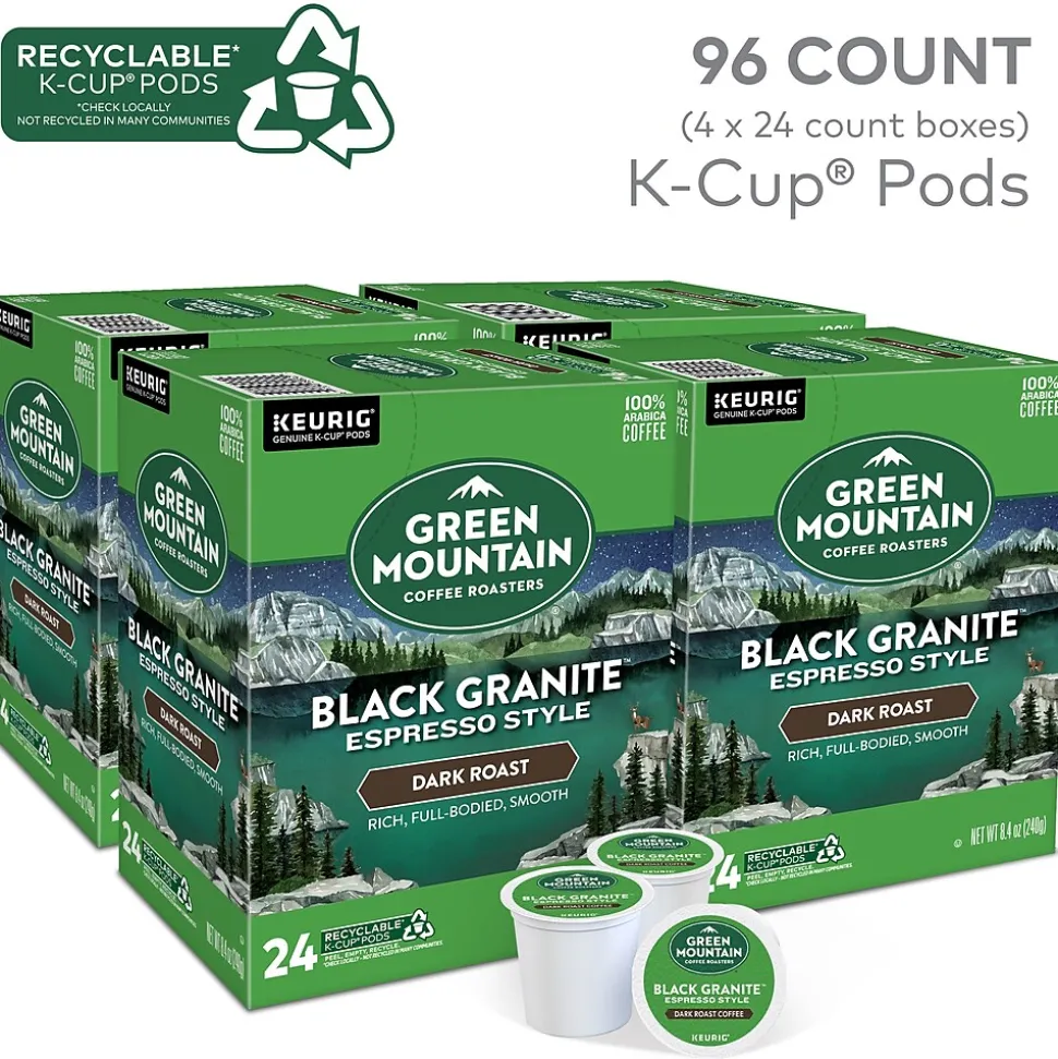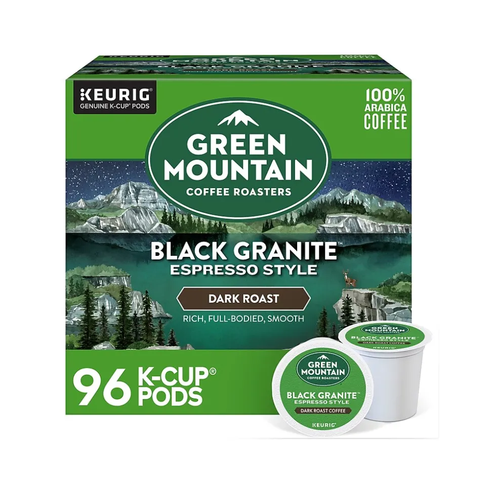 Take to the mountains from the comfort of your kitchen with Green Mountain Black Granite Espresso Style. Rich and full-bodied, with sweet, smoky notes unifying the flavors of dried fruit and toasted nuts, this espresso-style coffee is as powerfully strong, profoundly smooth, and distinctively dark as the name implies. Each sip is an exploration of expertly crafted beans, roasted to perfection. This single-serve K-Cup pod is filled with freshly ground, 100% responsibly sourced 100% arabica beans ready for your Keurig single-serve K-Cup pod coffee maker. Plus, the pod is recyclable. The Green Mountain Black Granite Espresso Style dark roast is the flavorful escape you’ll enjoy with peace of mind, time and time again. Green Mountain is driven to bring the world a richer, better cup of coffee. From the genuine K-Cup pods, optimally designed to deliver an elevated coffee experience at the press of a button, to your favorite awaiting coffee mug, cheers to the adventure of what’s next. Be bold. Be alive. Grab a cup and get out there.