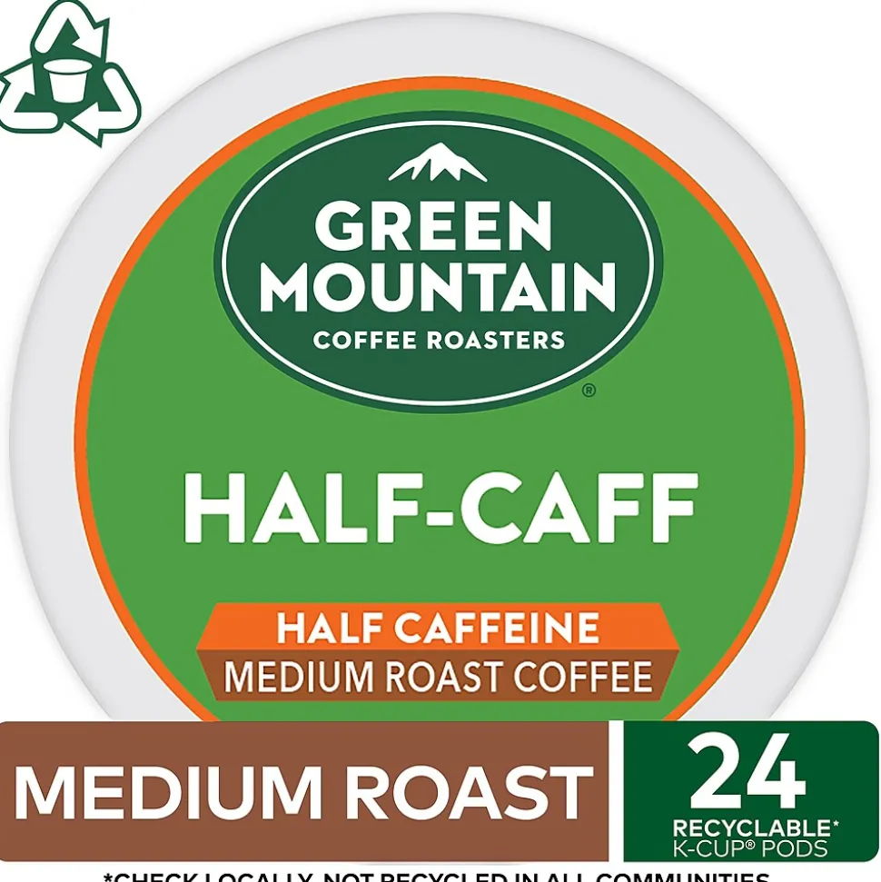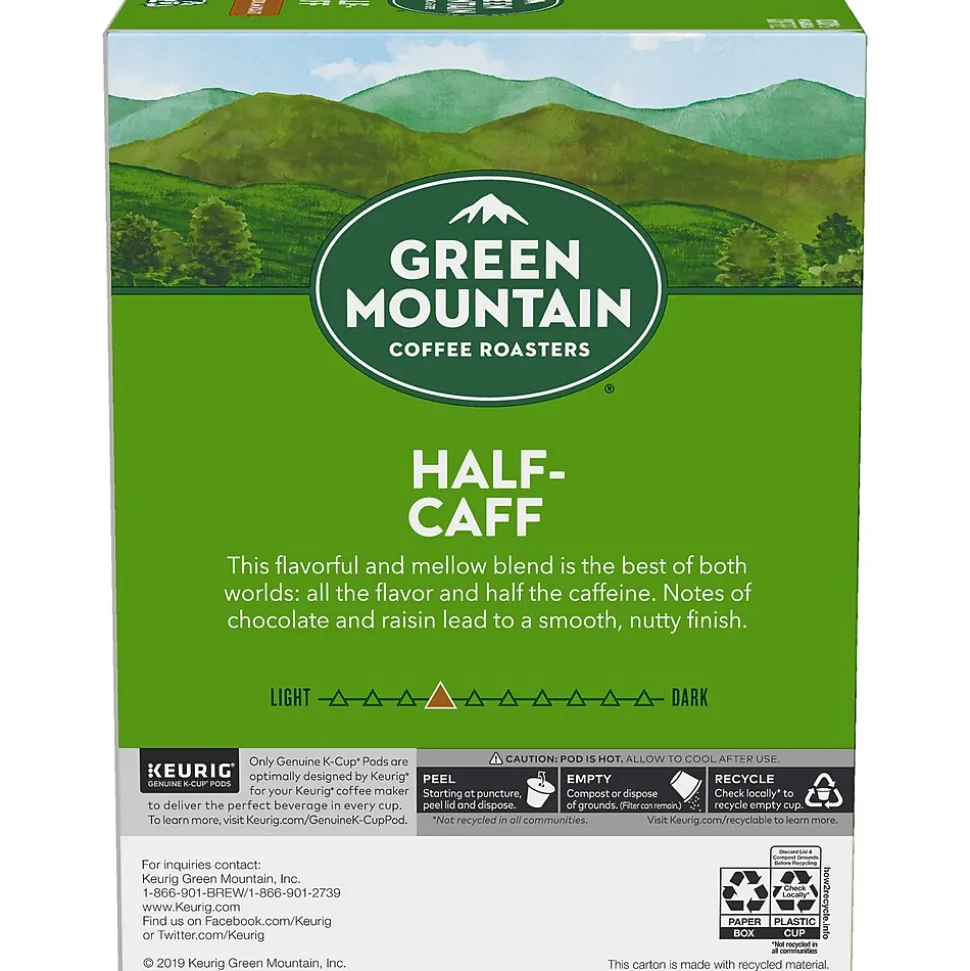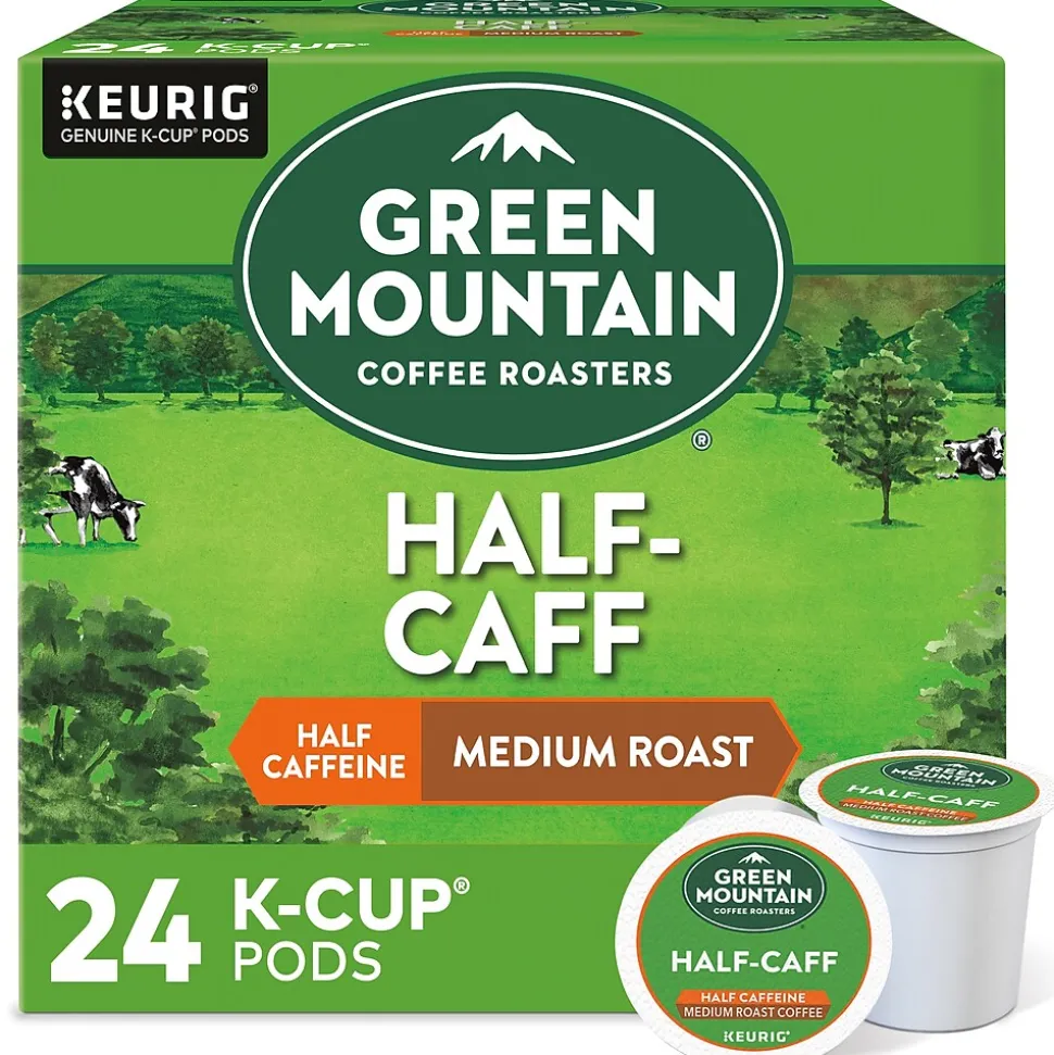 Stock beverage stations and break rooms with these Green Mountain Coffee Roasters Half-Caff coffee Keurig K-Cups. Notes of chocolate and raisins deliver a rich, smooth taste, while the half-caffeinated format is a perfect option for a midday treat. These Green Mountain Coffee Roasters Half-Caff coffee Keurig K-Cups come in a 24-count package, ensuring a convenient supply for your staff or office visitors. This flavorful and mellow blend is the best of both worlds: all the flavor and half the caffeine. Notes of chocolate and raisin lead to a smooth, nutty finish.