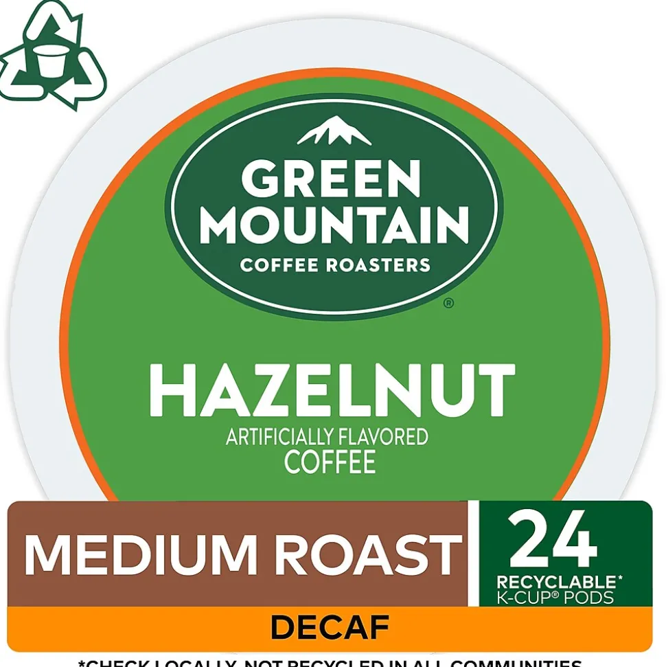 Make your day a little brighter with these hazelnut coffee pods. Each one is caffeine-free, making it ideal for those monitoring their daily intake, these Keurig K-Cup Green Mountain Coffee Roasters hazelnut decaffeinated coffee pods are light-roasted and come in a 24-pack, so you can replenish your supply easily. Indulge in the sweet, buttery decaf flavor of hazelnut. A lighter-roasted coffee, our Hazelnut is rich and satisfying with the flavor of warm, roasted nuts.
