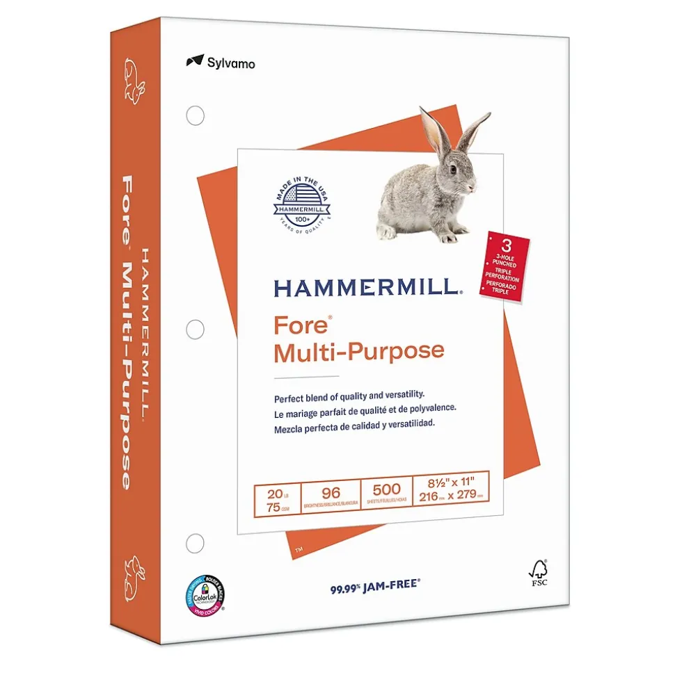 Keep your desktop or home office printer ready for daily printing needs with this Hammermill Fore three-hole punch multipurpose copy paper. The conveniently spaced holes work with standard binders for easy document retention, and the 96 brightness level is pleasing to the eye. With ColorLok technology, this Hammermill Fore three-hole punch multipurpose copy paper delivers bolder black and more vibrant color for high-quality prints.