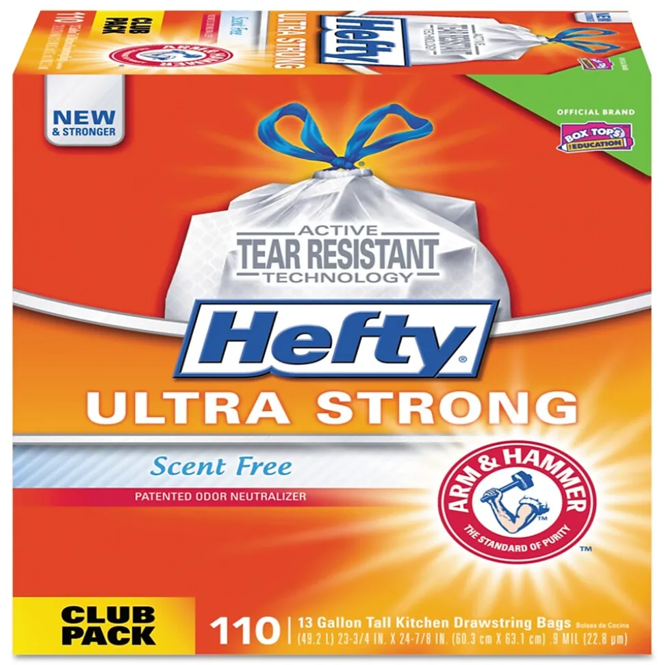 Strong and durable; easy to lift and carry. Convenient drawstring closure. Patented Arm & Hammerâ„¢ Odor Neutralizer eliminates garbage odors without adding any unwanted scents or fragrances; leaves your kitchen smelling the way you want.
