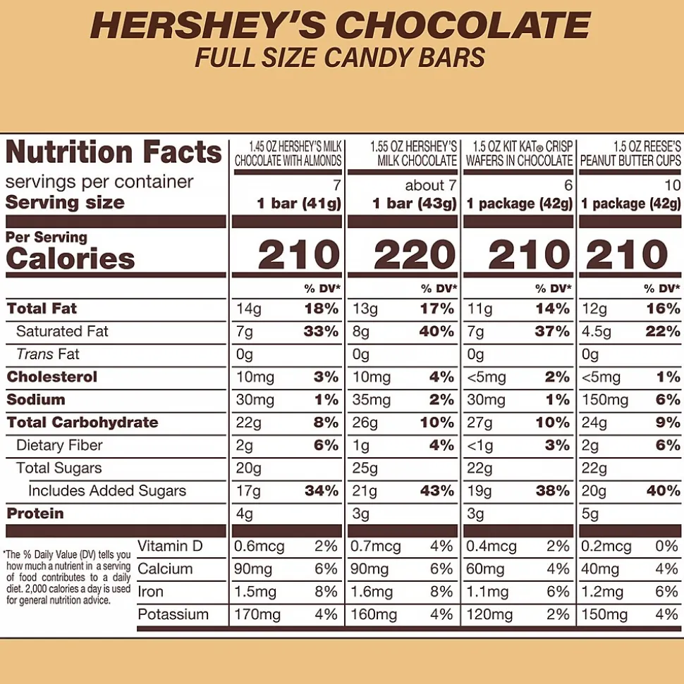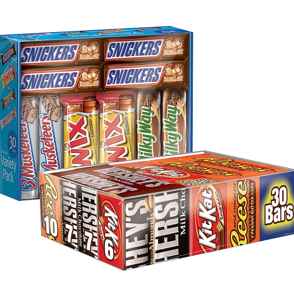 - Hershey Chocolate Full Size Variety Pack (KIT KAT Wafer Bars, REESE’S Peanut Butter Cups, HERSHEY’S Milk Chocolate Bars, and HERSHEY’S Milk Chocolate with Almonds Bars), 45 oz, 30 Count and MARS Chocolate Full Size Candy Bars Assorted Variety Box (SNICKERS, TWIX, MILKY WAY and 3 MUSKETEERS Chocolate Candy Bars) 55 oz, 30 Count