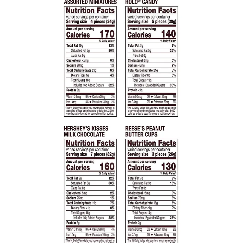 - Includes HERSHEY’S Miniatures assorted chocolate candy bars, REESE’S Miniatures milk chocolate peanut butter cups candy, HERSHEY’S KISSES milk chocolate candy and ROLO® rich chocolate caramel candy