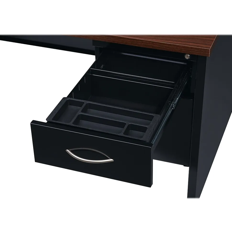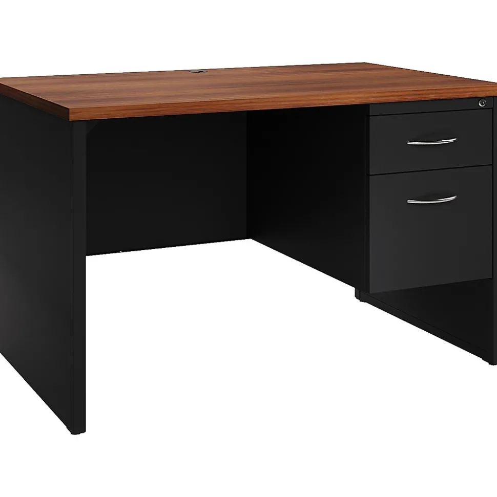 Modular single pedestal desk. Includes a core removable lock. Box and file drawers feature full extension slides and premium satin nickel Arch pull handles. Precision ball-bearing suspension. Durable laminate work surface with grommet holes for cord management. Radiuses profile edge banding for enhanced comfort. Full height end panels with leveling glides. One pencil tray standard per desk and one drawer divider standard per box drawer. Meets or exceeds ANSI-BIFMA standards and contains up to 28 percent recycled material. This desk is a part of our Executive Modular Desk Collection.