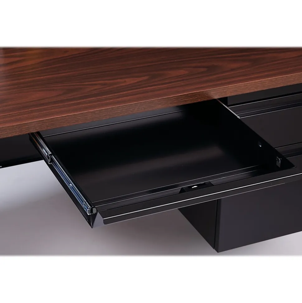 - Modern-style desk is constructed of high-quality steel in black with laminate work surface in a walnut finish