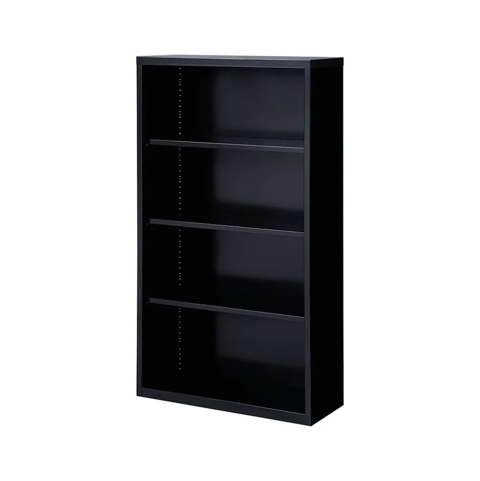 - Four-shelf steel bookcase in baked black enamel finish perfect for schools, libraries, and offices