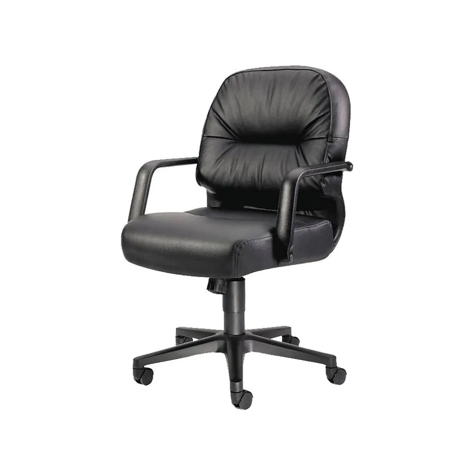 The HON pillow-soft executive chair in black is made of durable leather and is ideal for office desks. This chair measures 41.75 x 26.25 x 28.75 inches and has a back cushion that combines both foam and a layer of polyester fiberfill to support your spine.