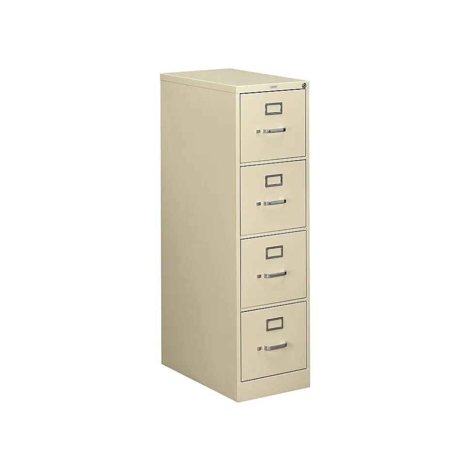 - Four-drawer vertical filing cabinet holds letter-size documents