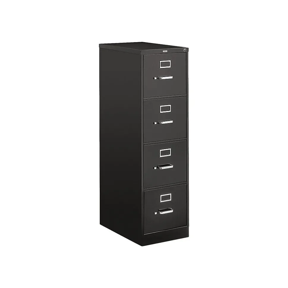 - Four-drawer vertical filing cabinet holds letter-size documents