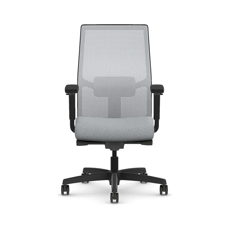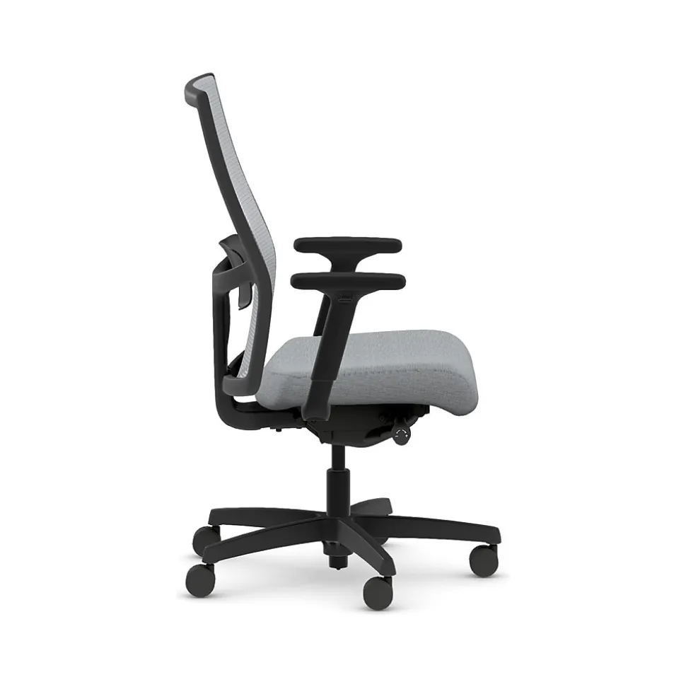 - Four-way stretch mesh back in fog gray, Hamilton cloud gray fabric seat, and black frame