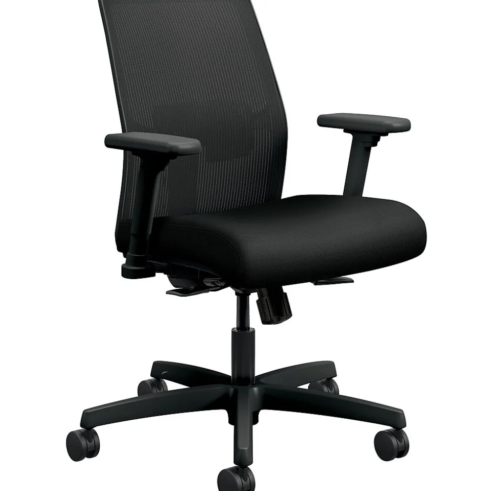 Breathable Ilira-stretch mesh back cradles your spine with natural lumbar support and increases airflow. The Synchro-tilt control mechanism with seat slider reclines the back and seat in the perfect ratio to give you a natural posture, whether sitting upright or leaning back. Height- and -width adjustable arms and an adjustable lumbar support provide a custom fit. Easy assembly. Supports up to 300 lb.