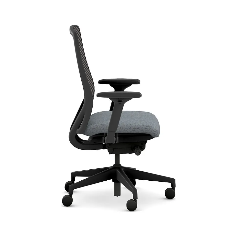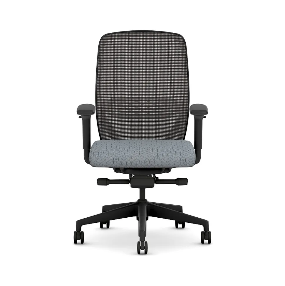 - Four-way stretch mesh back in black, Apex Basalt gray fabric seat, and black frame