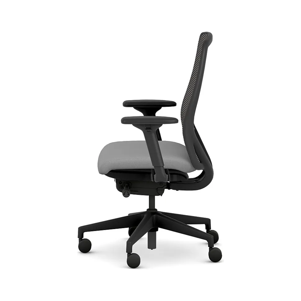 - Four-way stretch mesh back in black, Centurion frost gray fabric seat, and black frame