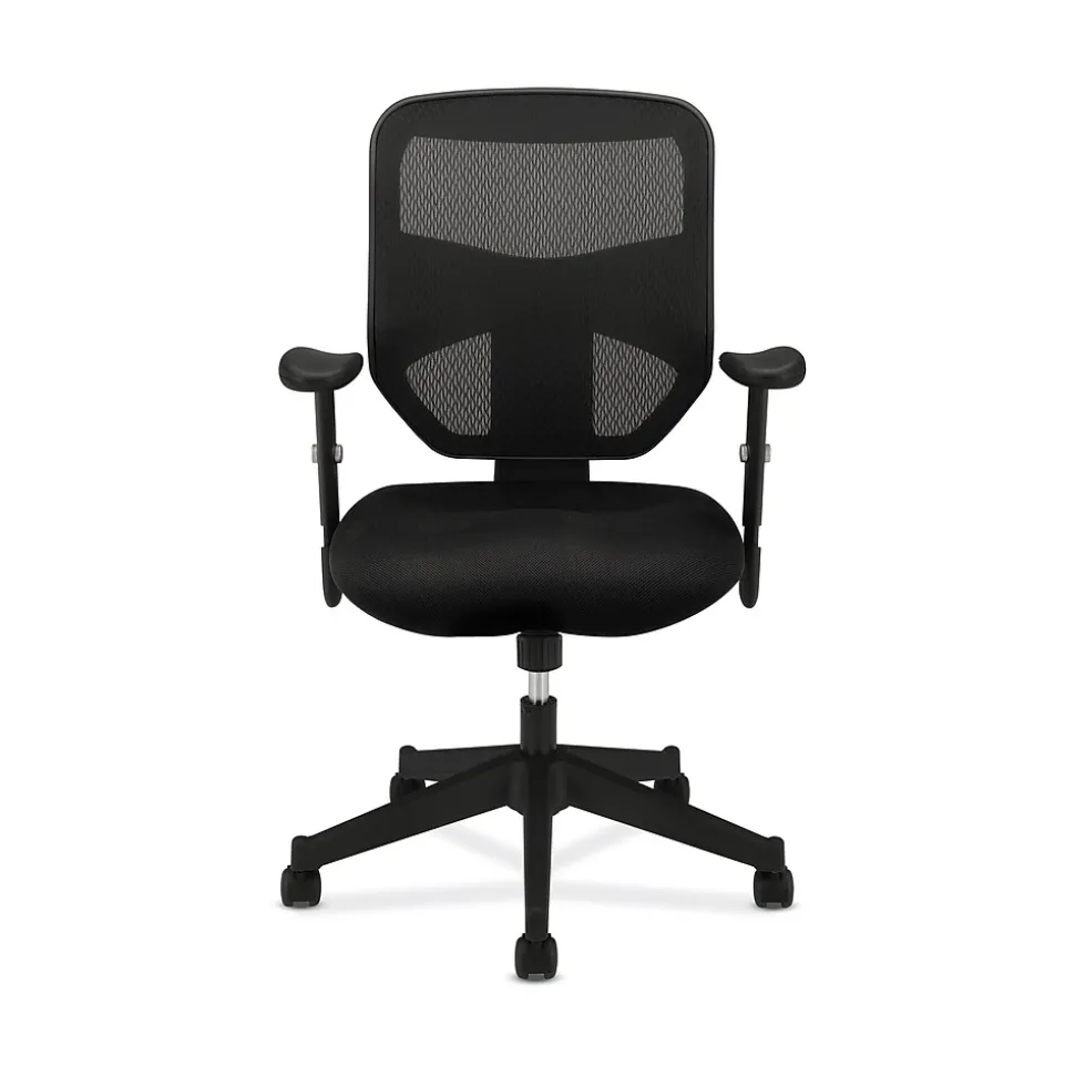 A mesh back, waveform seat and height-adjustable padded arms give this chair an upscale feel at a compelling price. Seat upholstery color is Black and back mesh color is Black.