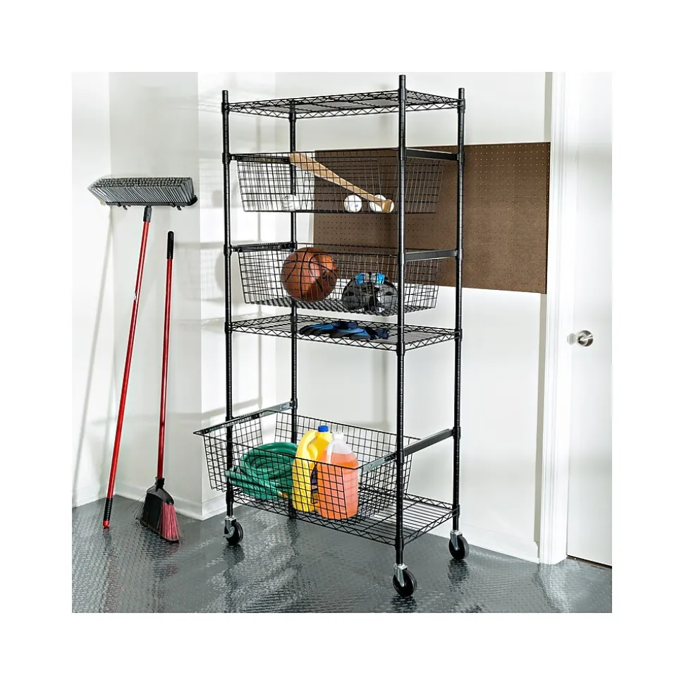 - Heavy-duty shelves hold up to 200 lbs. each, while deep baskets hold up to 40 lbs. each