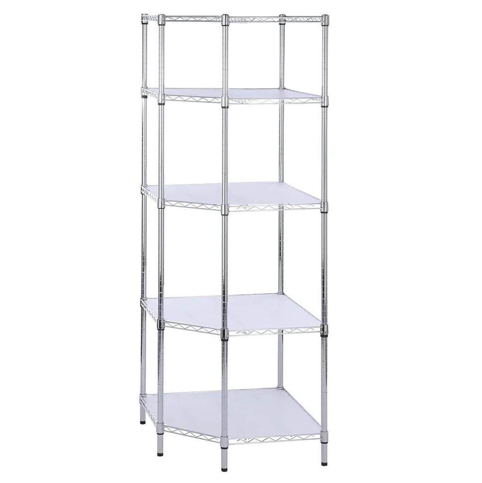 Honey-Can-Do 5-Tier Corner Shelf Unit, Chrome. Create visible, accessible storage space instantly with Honey-Can-Do industrial shelving systems. Contemporary chrome finish and 72″ steel frame make this unit the perfect blend of style and functionality. Durable enough for the mudroom, garage, or commercial kitchen; this unit is capable of withstanding up to 350lbs per shelf and its unique design makes it perfect for a corner. Adjustable shelves allow you to change the configuration as your storage needs evolve. Clear shelf liners included.