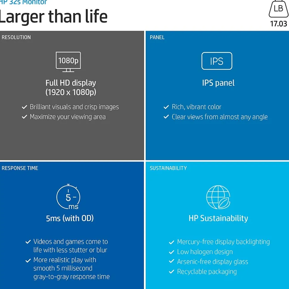 Home entertainment reaches new heights on a spacious 32” diagonal display. Maximize immersion while watching movies, and multitask with multiple windows on a full-sized screen. With its vibrant visuals and versatile connectivity options, everything on screen comes to life in dazzling clarity. Bolster your entertainment experience with an expansive 31.5” diagonal FHD resolution display that delivers 70% more screen than a 24” monitor. Plus the 178 degree viewing angle gives you sharp picture from all sides. Watch your media come to life in rich, vibrant color with IPS technology. From vacation photos, to movies and games—everything is portrayed in striking detail with 99% sRGB accuracy.