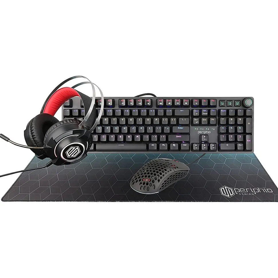 - Includes a 24″ LCD monitor (with cables), RGB mechanical keyboard and mouse, RGB computer speakers, an RGB headset, XXL Periphio desk mat, and power cord for immediate setup