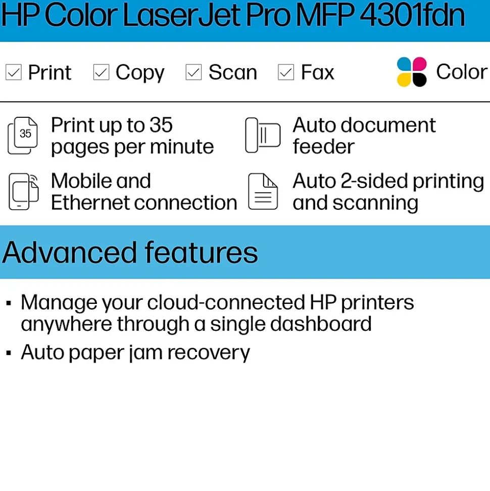 Get vibrant laser-quality color and powerful productivity with the Color LaserJet Pro MFP 4301fdn. Super fast and super easy with advanced features for small teams.