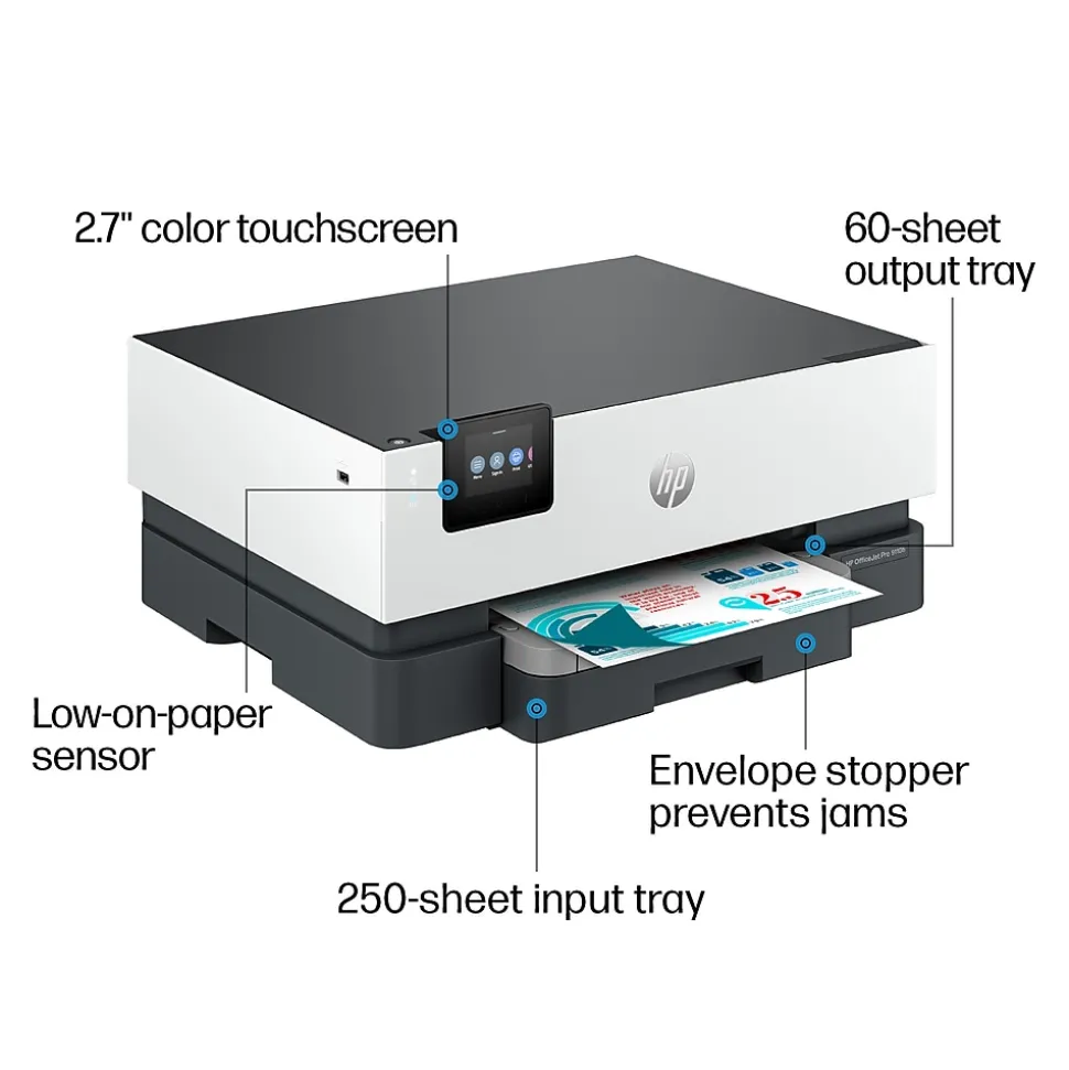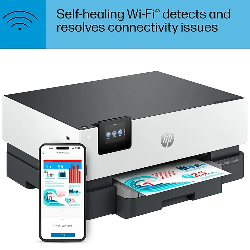 The HP OfficeJet Pro 9110b delivers fast color printing, 250-sheet paper capacity, and duplex printing. It includes wireless and printer security capabilities to keep your inkjet printer up to date and secure.