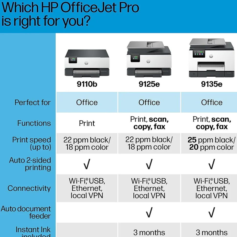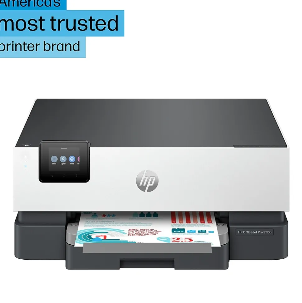 - FROM AMERICA’S MOST TRUSTED PRINTER BRAND – The OfficeJet Pro 9110b is perfect for offices printing professional-quality color documents like presentations, brochures and flyers. Print speeds up to 18 ppm color, 22 ppm black. Great for remote teams.