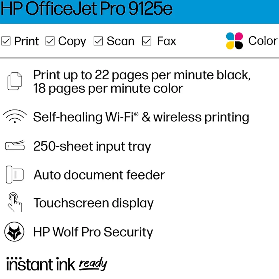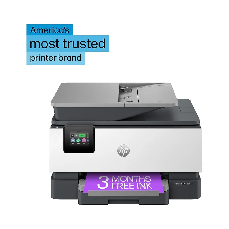 The HP OfficeJet Pro 9125e delivers fast color printing, 250-sheet paper capacity, and duplex scanning and copying. It includes wireless and printer security capabilities to keep your multifunction printer up to date and secure.