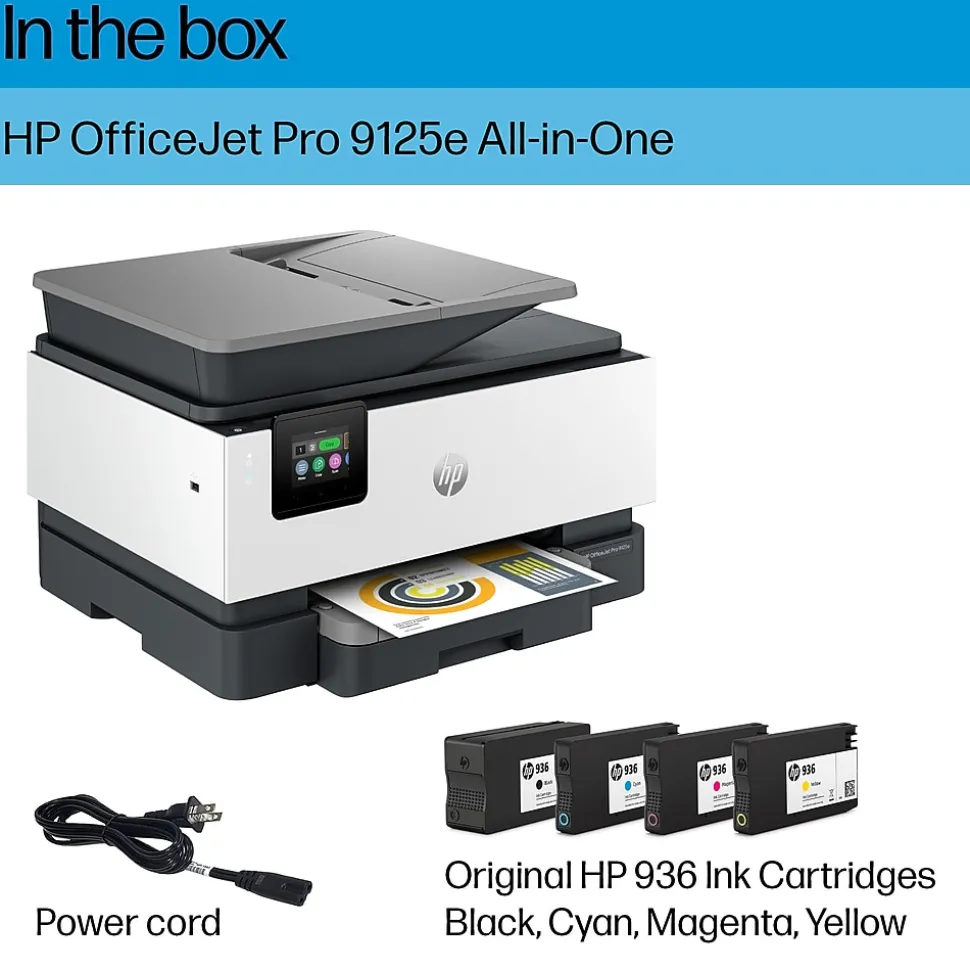 - WHAT’S IN THE BOX – 403X0A HP OfficeJet Pro 9125e All-in-One Printer, Original HP 936 Ink Cartridges (black, cyan, magenta, yellow), user flyers, setup poster, power cord.