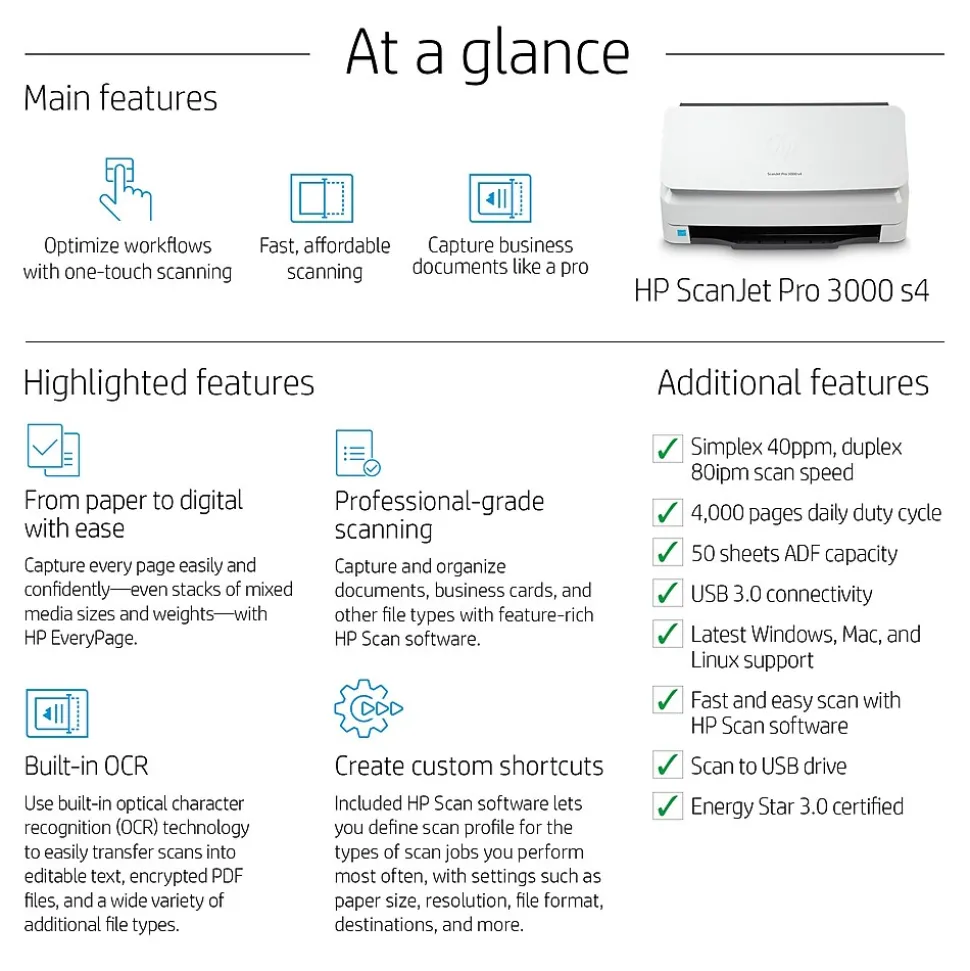 This HP Scanjet Pro desktop scanner is fast, affordable, and designed to handle everything from simple color jobs to complex workflows. Quickly and reliably digitize larger projects with scan speeds up to 40 ppm/80 ipm and a 50-page ADF. Recommended for 4000 pages per day.