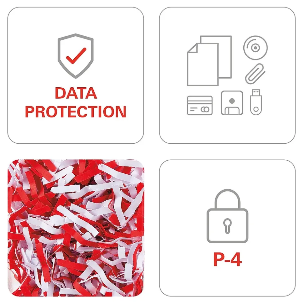 - Optimized cutting device technology destroys 43-46 sheets of paper, creating 517 cross-cut / confetti-cut particles per page