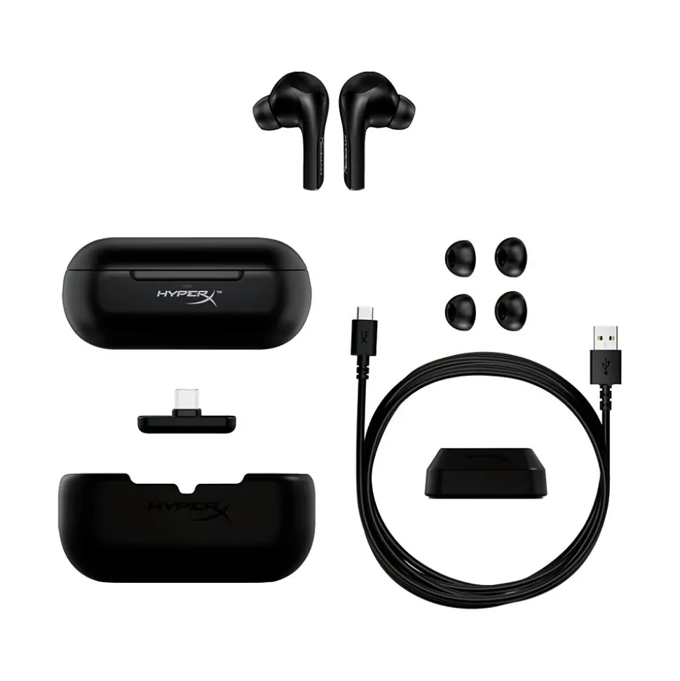 - Package includes: two earbuds, 2.4GHz USB Type-C wireless adapter, charging case and silicone cover, USB Type-C to Type-A charge cable, extension adapter, silicone ear tips (three sizes), quick start guide