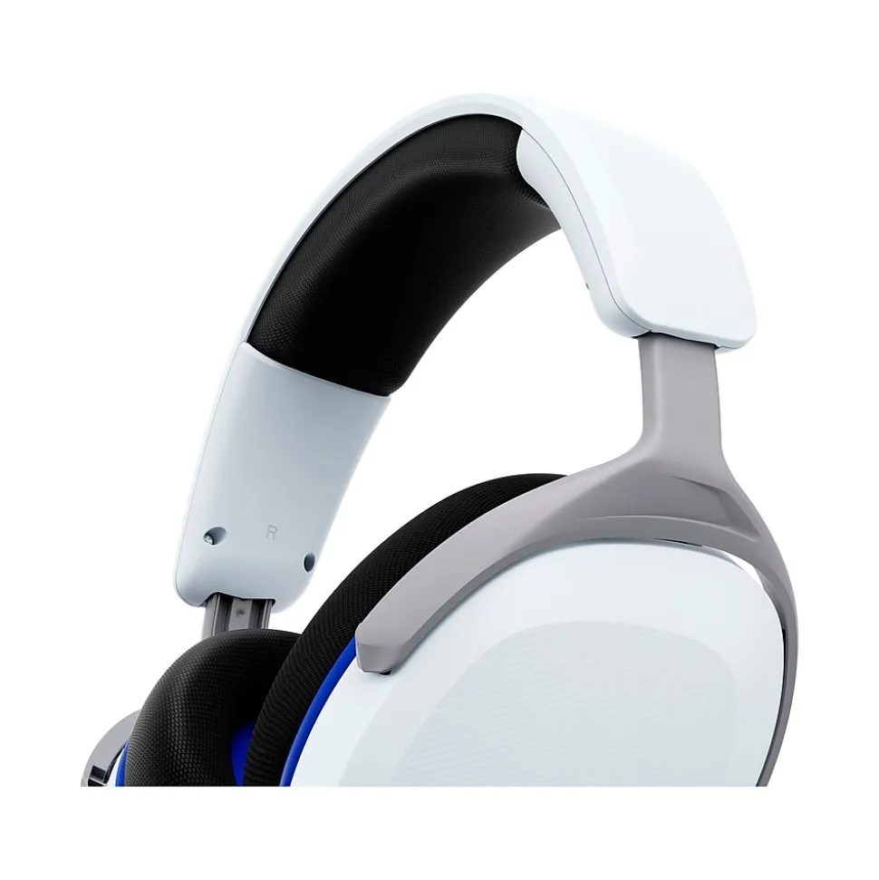 - Features an over-the-ear design in white with blue, gray, and black accents