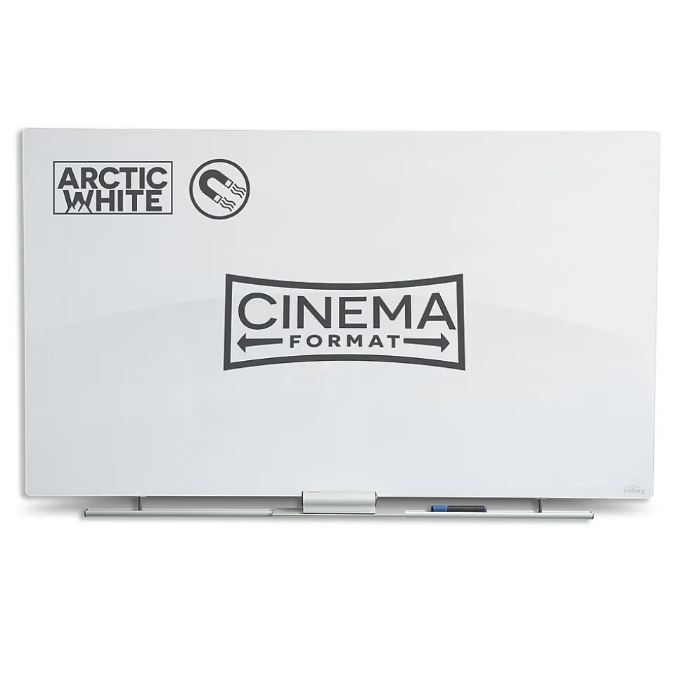Iceberg Clarity Magnetic Glass Dry Erase Board in Cinema wide format is optimal for viewing and writing. Low iron, ultra clear tempered safety glass with distinctive arctic white backing, results in a crisp, vibrant and easy to read surface. Glass is stain free and erases clean with ease. Magnetic glass surface doubles as a place to share, and post, brainstorming ideas and inspirations. Sleek, stunning aluminum marker rail floats below the glass surface keeping markers and erasers out of the way. Includes an Ergo-grip aluminum eraser, 2 hi-powered magnets and a black dry erase marker.