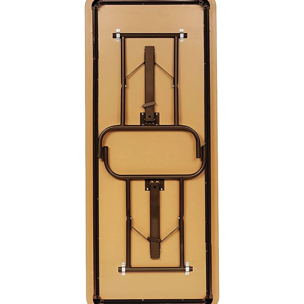 - Folding tables feature a wear-resistant, 3/4″ top surface; laminated melamine over particle board with a melamine-sealed underside and bull-nose vinyl T-mold edging