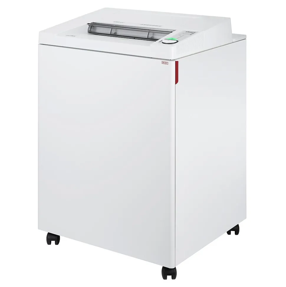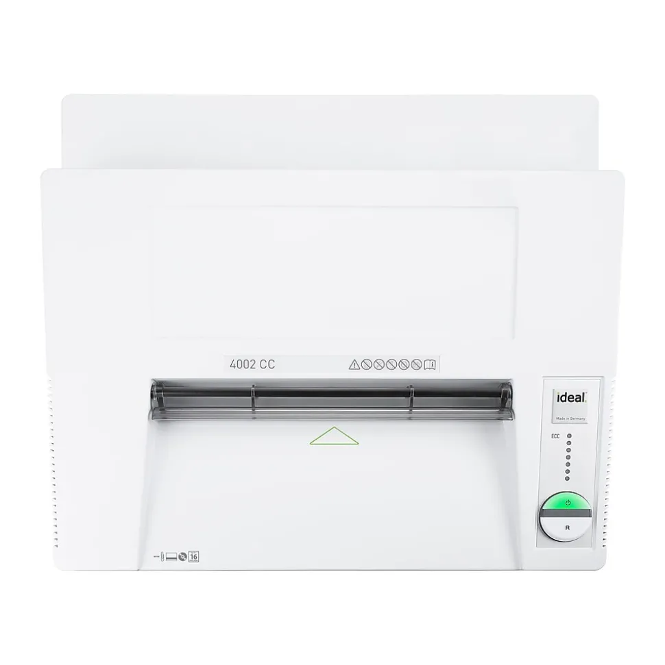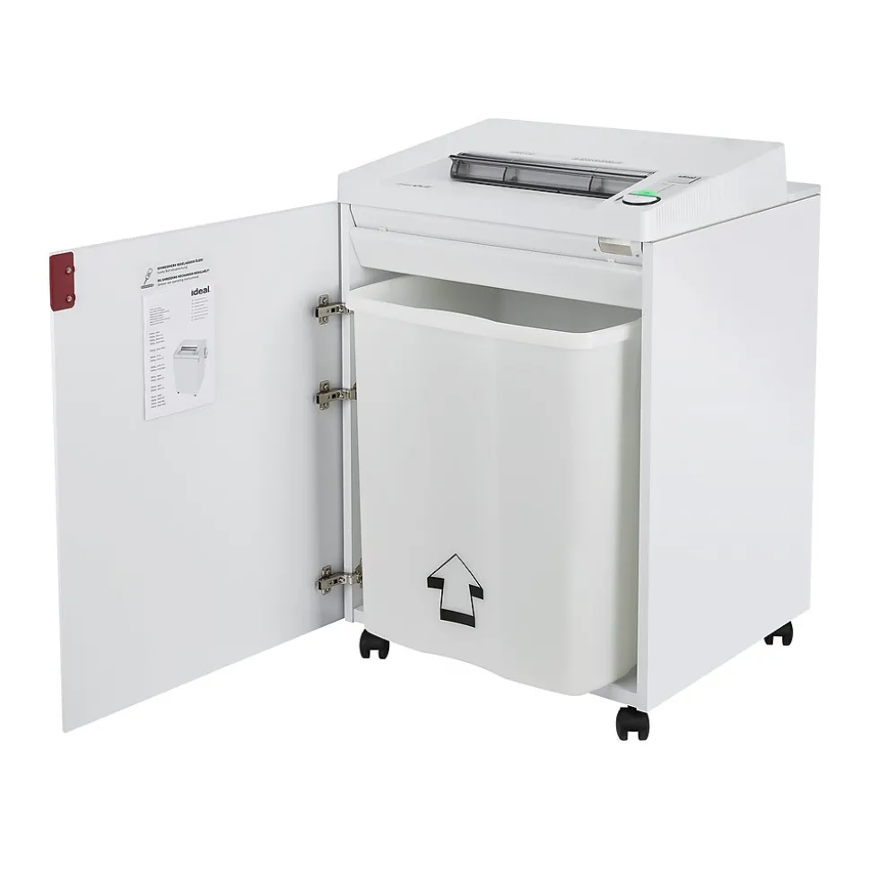 The 4002 cross-cut P-5 shredder with automatic oiler is designed for the busy office and high-volume shredding environments. Best for 8–13 users, the 4002 is rated for continuous operation. High-quality, solid steel cutting heads minimize downtime while shredding paper, staples, paper clips, credit cards, and CD/DVDs. HIPAA and FACTA compliant, and certified to shred Personal Identifiable Information (PII) and Controlled Unclassified Information (CUI), it’s federally accepted to protect information and social security numbers against identity theft. Built with a high-quality, wooden, easy-open cabinet on casters, the 4002 shredder is equipped with a large, 16” feed opening and powerhouse, impact-resistant, and easily-removable 44-gallon bin. The large but quiet 1 3/4 horsepower motor chews through 16 sheets of paper at once and up to 565 sheets per minute. A patented, electronically-controlled, transparent safety shield in the feed opening protects fingers and hands, and the patented Electronic Capacity Control (ECC) monitors and grades document feeding to prevent jams. German engineering and manufacturing ensure superior quality that will provide many years of trouble-free operation. The 4002 is covered by a lifetime warranty on cutting shafts and wheels, 3-year limited warranty on all other parts excluding wearables, and 90-day limited warranty on labor or exchange at ideal’s discretion. The 4002 is delivered by truck and requires a loading dock for receipt.