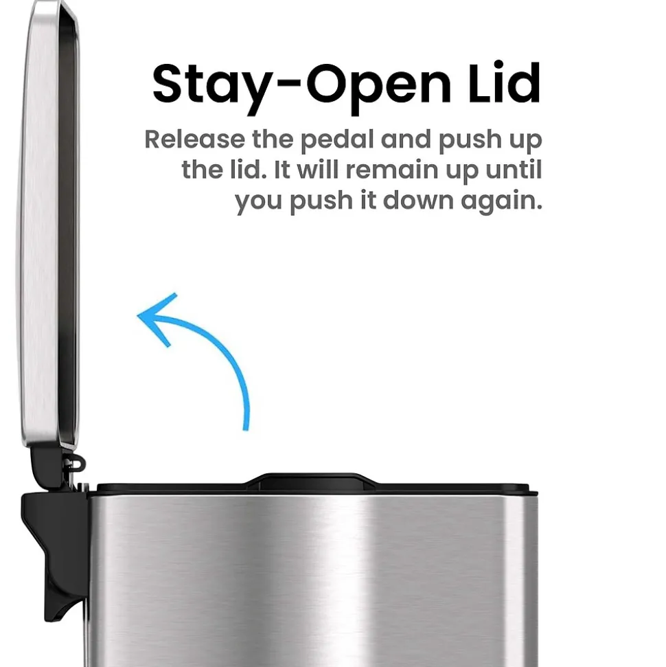 | Handles Trash can or recycling bin features. For example: molded hand grips, wide rim, step on, touchless | Fingerprint-resistant coating, smudge-resistant, replaceable air damper, AbsorbX technology |