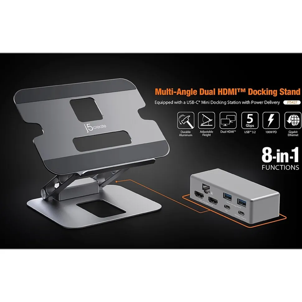 Made of durable aluminum, this j5create multi-angle stand can support a variety of items in addition to a laptop, including tablets, books, etc. The foldable design allows for easy storage or transport, while the viewing angles and heights can be adjusted to fit your needs and optimize your viewing experience. This versatile stand gives you the ability to create a more efficient workspace, whether you need extra space or a standing desk setup. The integrated USB Type-C mini dock lets you easily create a workstation with one 4K HDMI or dual 1080p HDMI display outputs, a Gigabit Ethernet port for easy network access, and two 5Gbps USB Type-A downstream ports, as well as a USB Type-C port that supports 5Gbps data transfer rate and up to 100W pass-through, providing all the connectivity you need for enhanced productivity and to connect your peripherals.